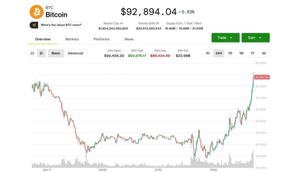 ビットコイン、米利下げ発表後の安値から9万3000ドルまで反発─···